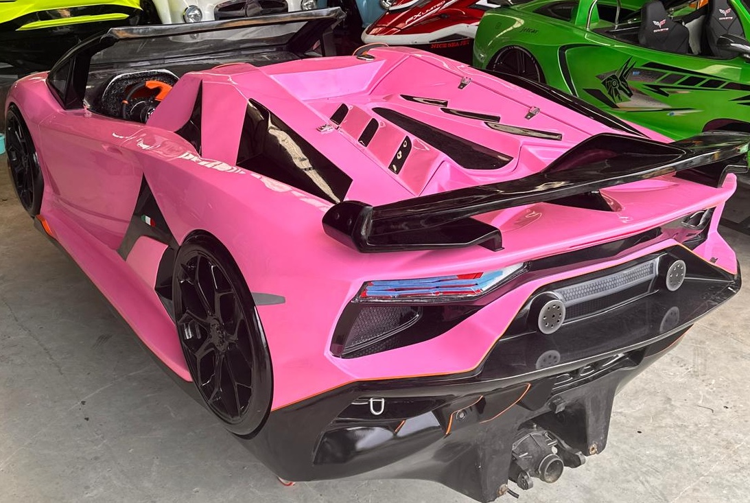 A Lamborghini Jetcar watercraft painted in sizzling hot pink, exuding boldness and luxury. Its sleek, aerodynamic design features sharp lines and a modern aesthetic, combining high-performance engineering with eye-catching color. The vibrant hot pink finish adds a touch of daring elegance, making it a standout piece on the water. Perfect for those who want to make a statement while enjoying the thrill of speed and style.